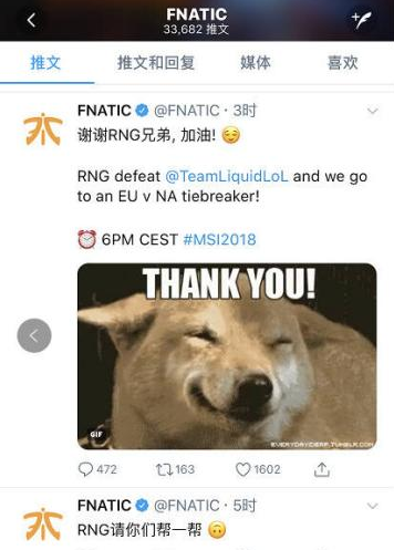 在小組賽的最后一天,FNC在晉級機會只能依靠RNG打敗TL然后再與TL爭奪晉級名額的情況下,用中文在推特上發了一句話“RNG請你幫一幫”,隨著RNG狀態的回升,擊敗了TL,隨后FNC也在加賽中戰勝TL晉級四強。看來這波中歐友誼,英雄聯盟是做了很大幫助了。