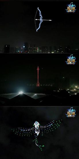 于無人機秀而言,數量越多表演難度越大,據悉《魔域》蜂群無人機燈光秀表演全過程都由電腦控制,憑借智能遠程控制和后臺路徑計算,實現對蜂群無人機陣型編隊和色彩燈光變幻——ShowTime遠沒有結束,蜂群無人機再度升空之后,召喚出精靈游俠原生寵在天空飛舞,扇動著雙翅栩栩如生;隨后錯落顆粒狀上升的無人機組成了當晚最大陣型,一支飽滿拉開的巨弓,射出了一支勢如破竹的光箭,仿佛濃縮了精靈游俠“聚能射擊”的無限能量,更蘊含著精靈游俠“蒼穹之怒”的颯爽英姿,不愧是黑科技!
